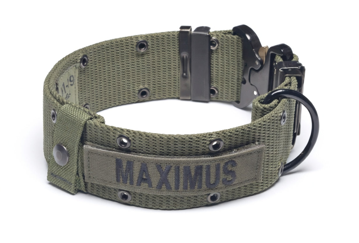 Hand made from US issue Military pistol belt and MIL-SPEC AustriAlpin buckle. Adjustable from 18"- 28" inches. 5" x 1" Velcro loop with custom name tape. Completely Indestructible. Made for the best of the best large breeds. *Contact Sales@M1-K9.com for custom larger or smaller sizes. *Name tape shipped separately.
